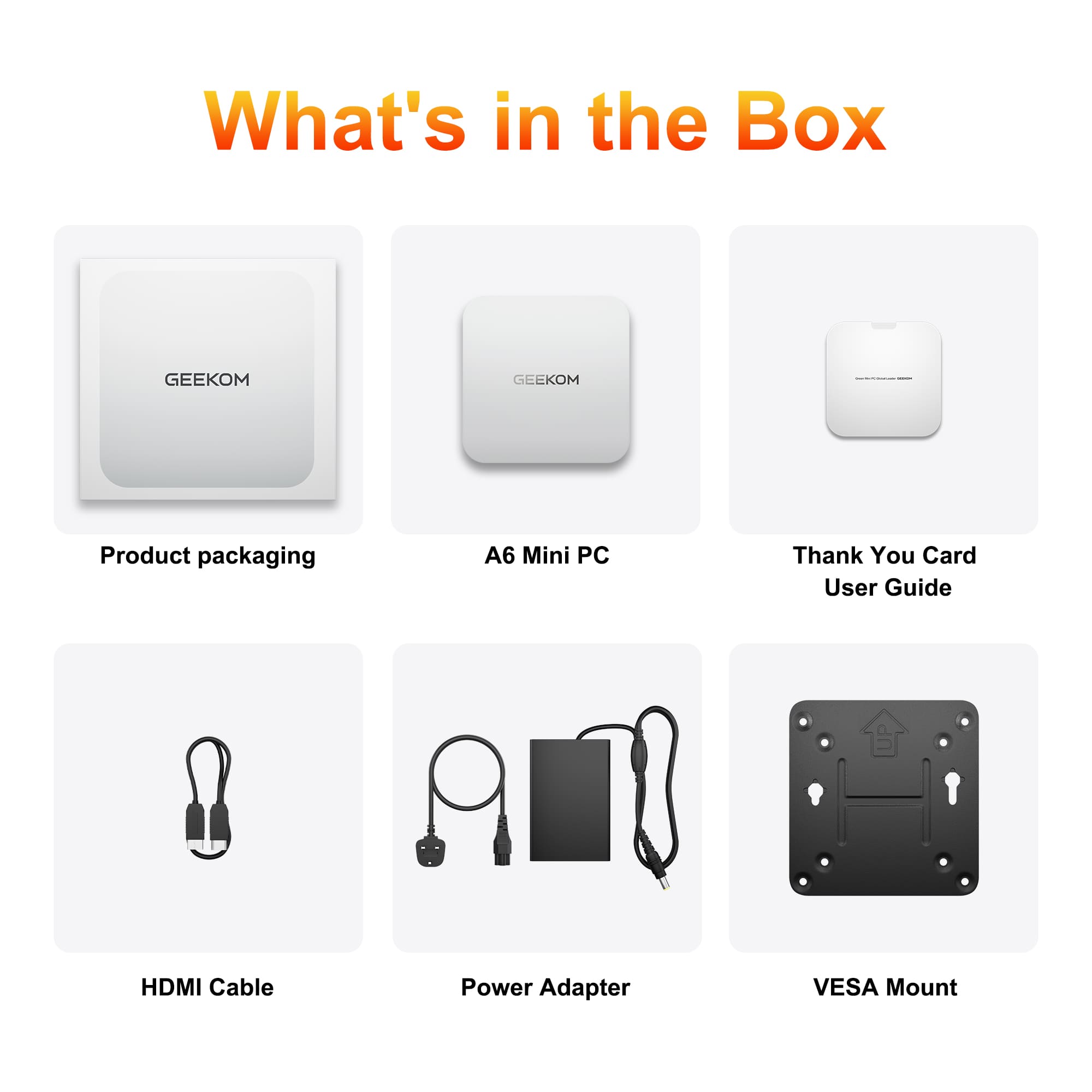 The Geekom A6 mini PC is designed with dimensions of 111.76mm × 111.76mm × 35.56mm, featuring a sleek and portable exterior. It is compact enough to fit in your pocket with ease. Whether you're on the go or in the office, it takes up minimal desktop space.The chassis is made from high-quality aluminum alloy, with a sleek and attractive design that stands out wherever it is.